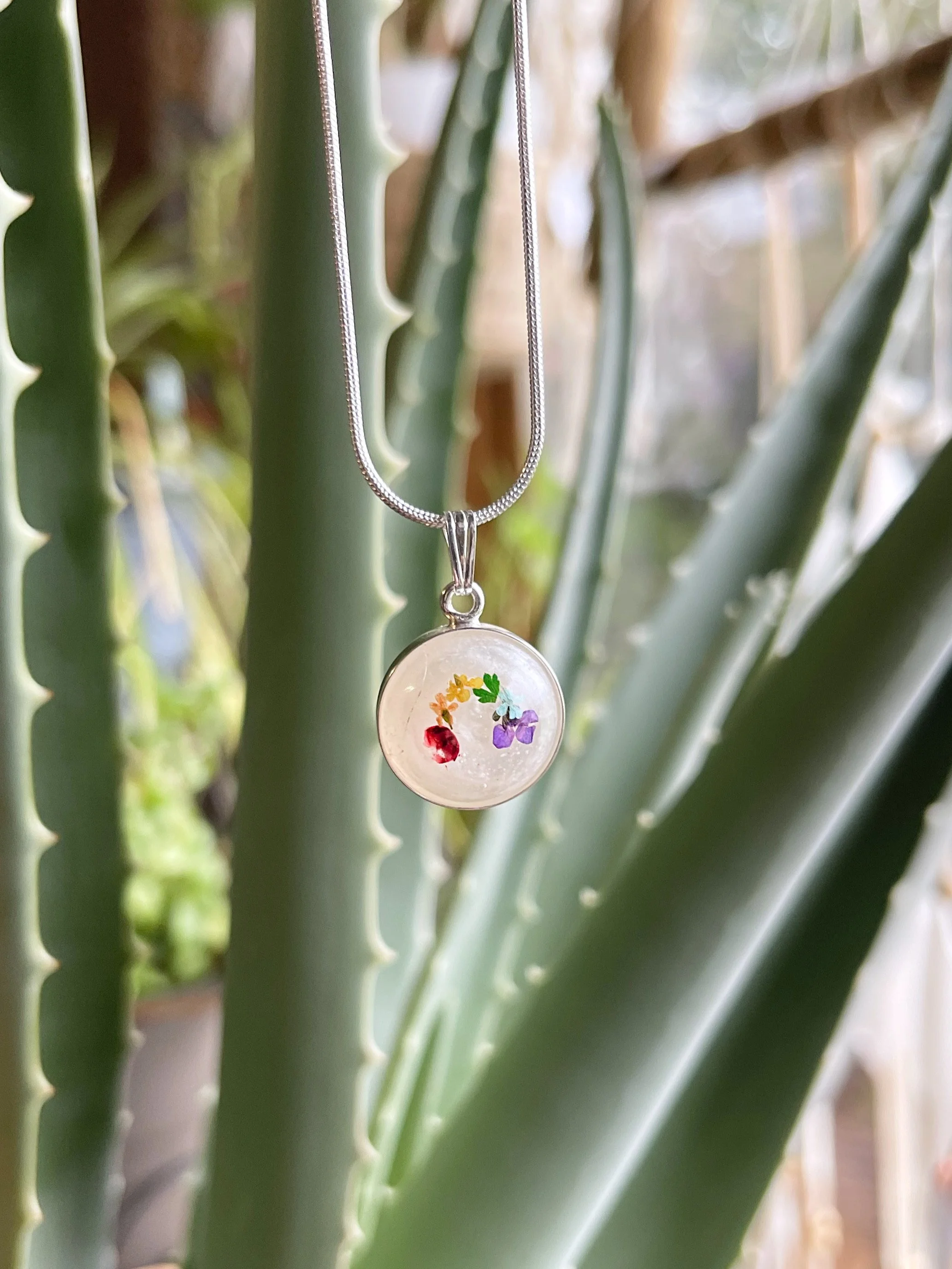 You have LOTS of options in the jewelry making process. All jewelry is 925 sterling silver, handmade by a local artist. Being open and giving creative freedom to the artist is a must. After ordering you’ll receive a google form with all of the options possible. Some but not all options are shimmer, opal flakes, dried flowers in every color, charms, color. You can even send us a piece of hair to add in. The possibilities are endless! We accommodate all special requests & custom orders, there is nothing we can't achieve in this art industry.